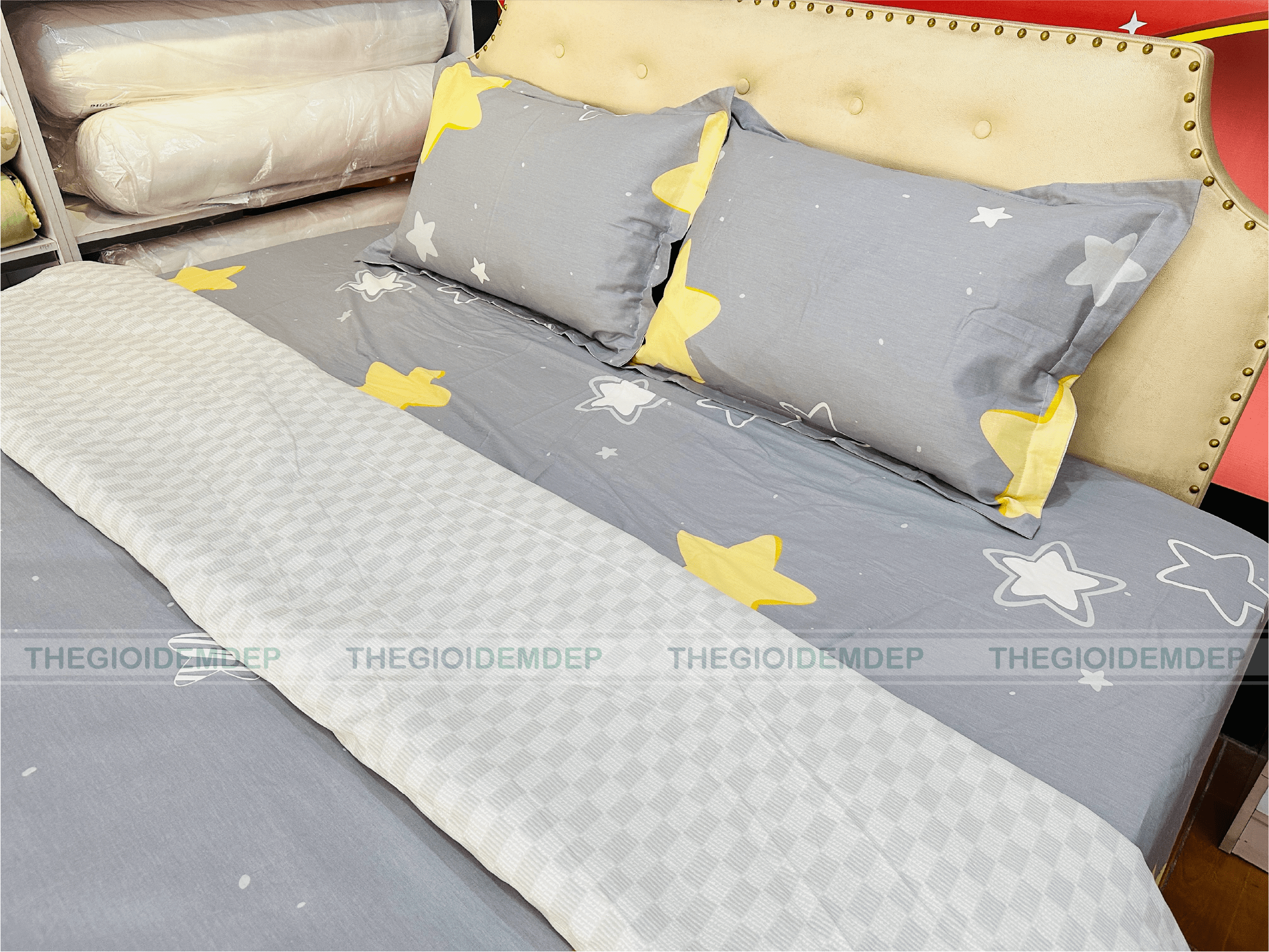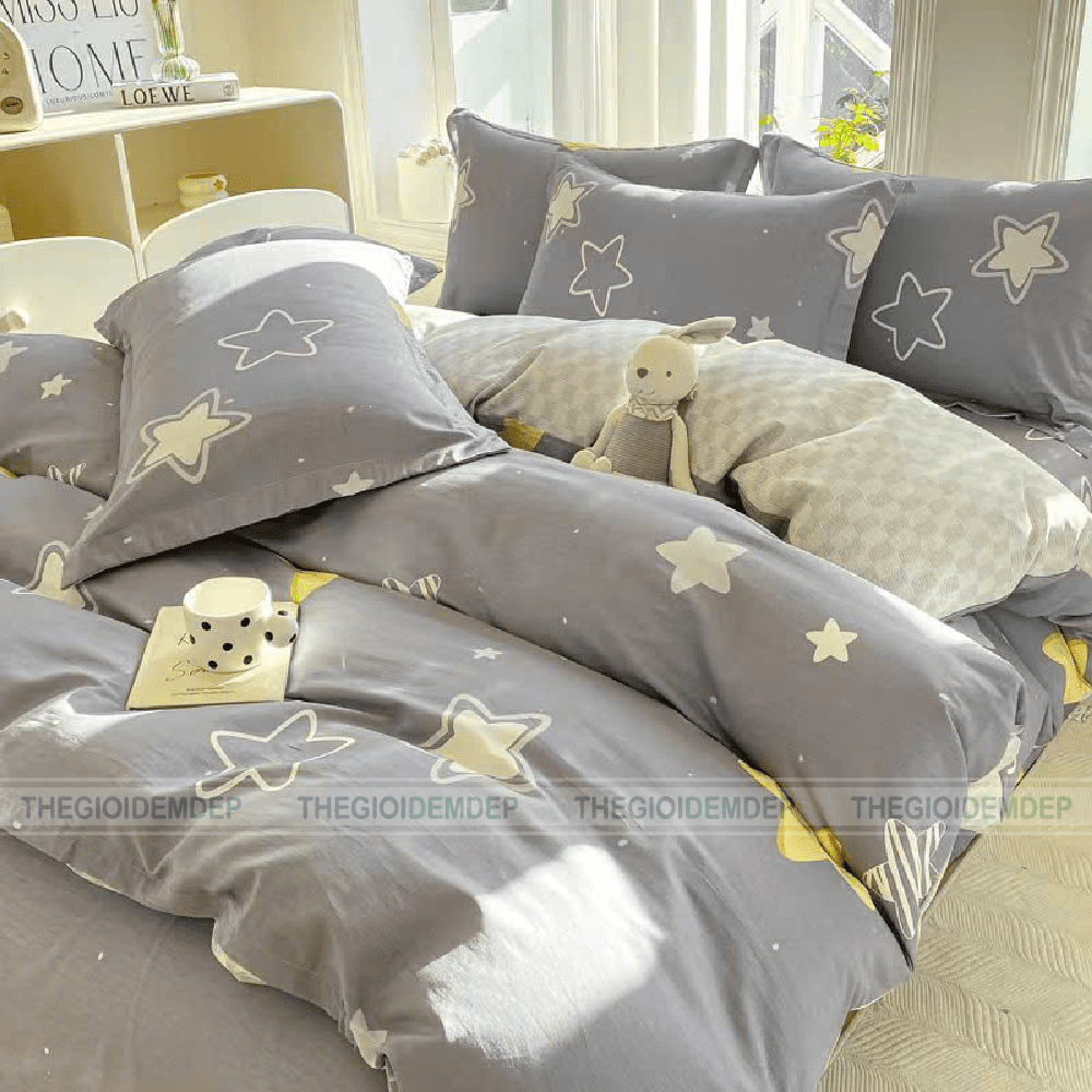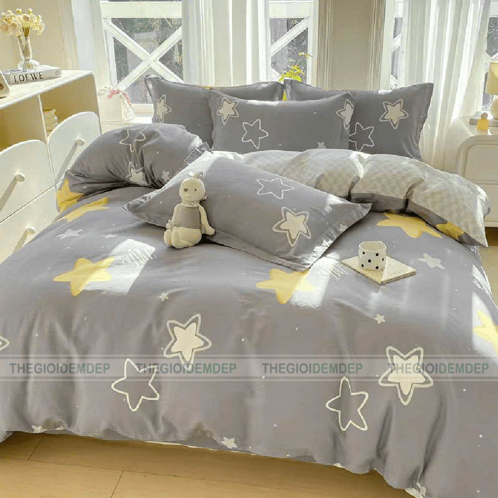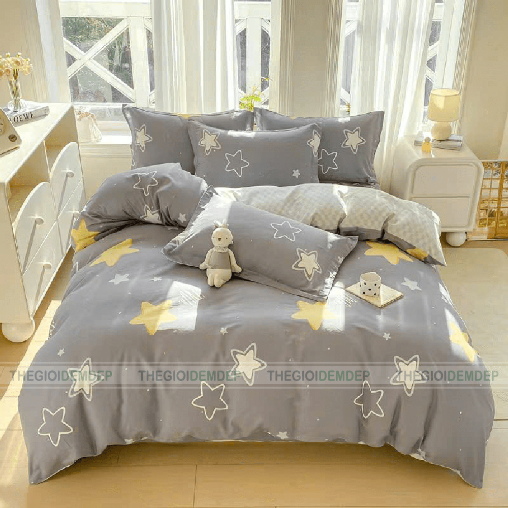 Với gam màu xám trung tính làm chủ đạo, kết hợp với các họa tiết ngôi sao vàng và be. Bộ sản phẩm tạo điểm nhấn nhẹ nhàng và tinh tế. Được làm từ chất liệu cotton thoáng mát đem lại cảm giác mềm mại, êm ái, nâng niu mọi giấc ngủ. Thiết kế phù hợp với nhiều phong cách nội thất khác nhau, đây là sự lựa chọn hoàn hảo cho những ai yêu thích sự đơn giản nhưng vẫn nổi bật và cá tính.