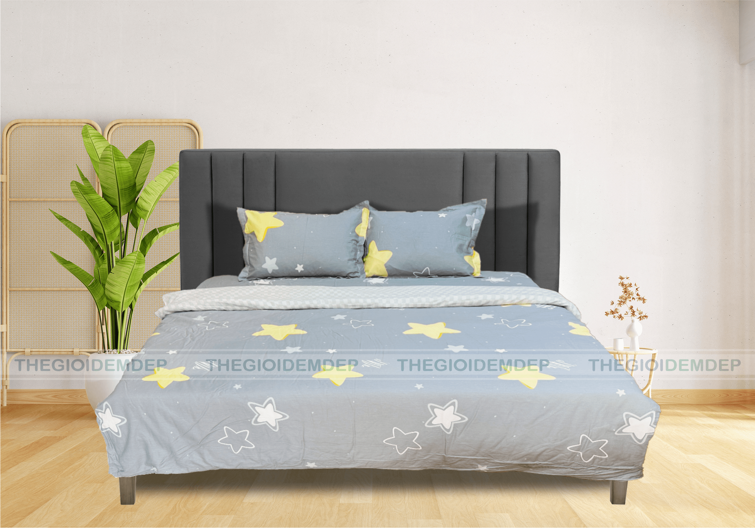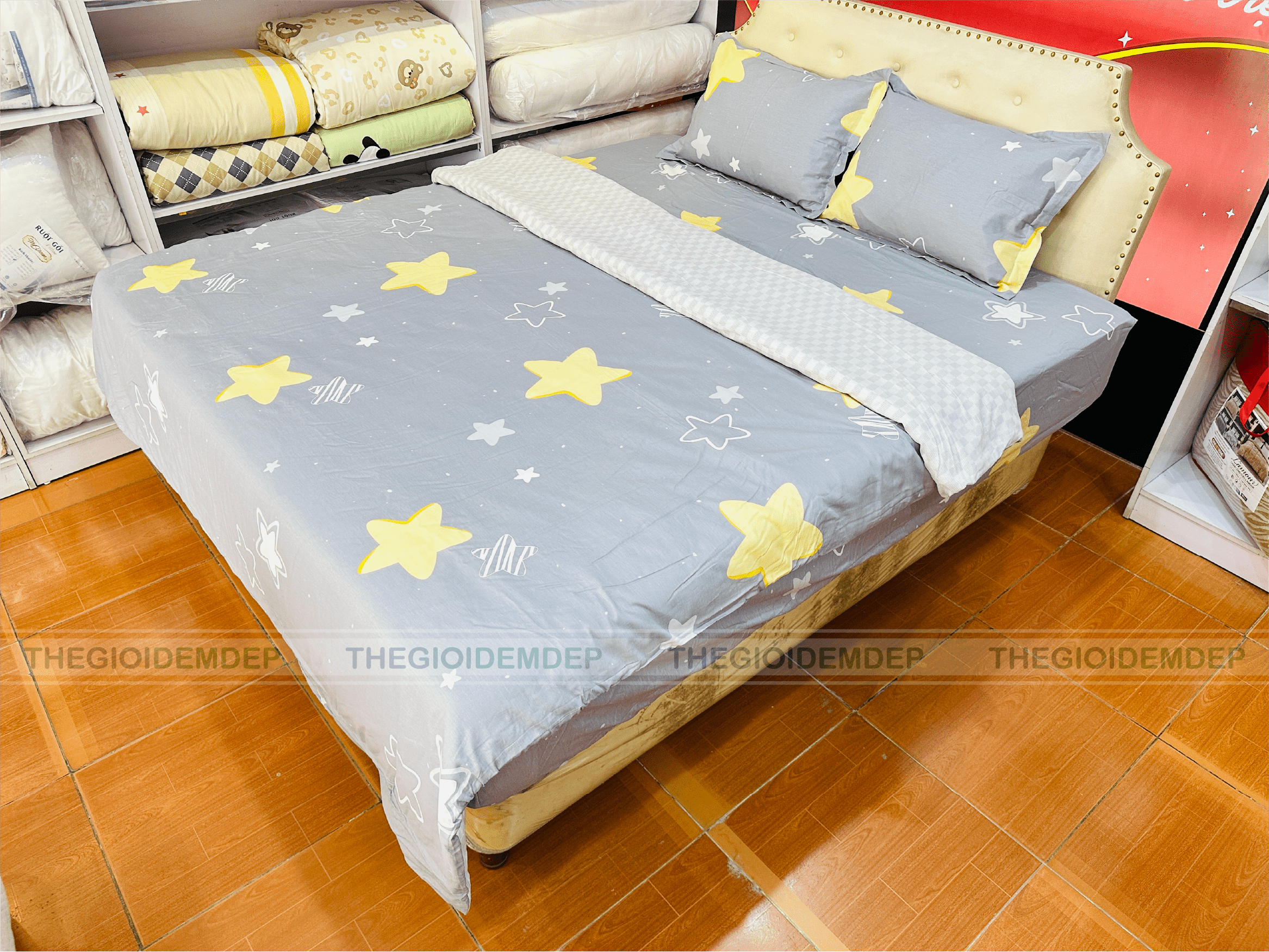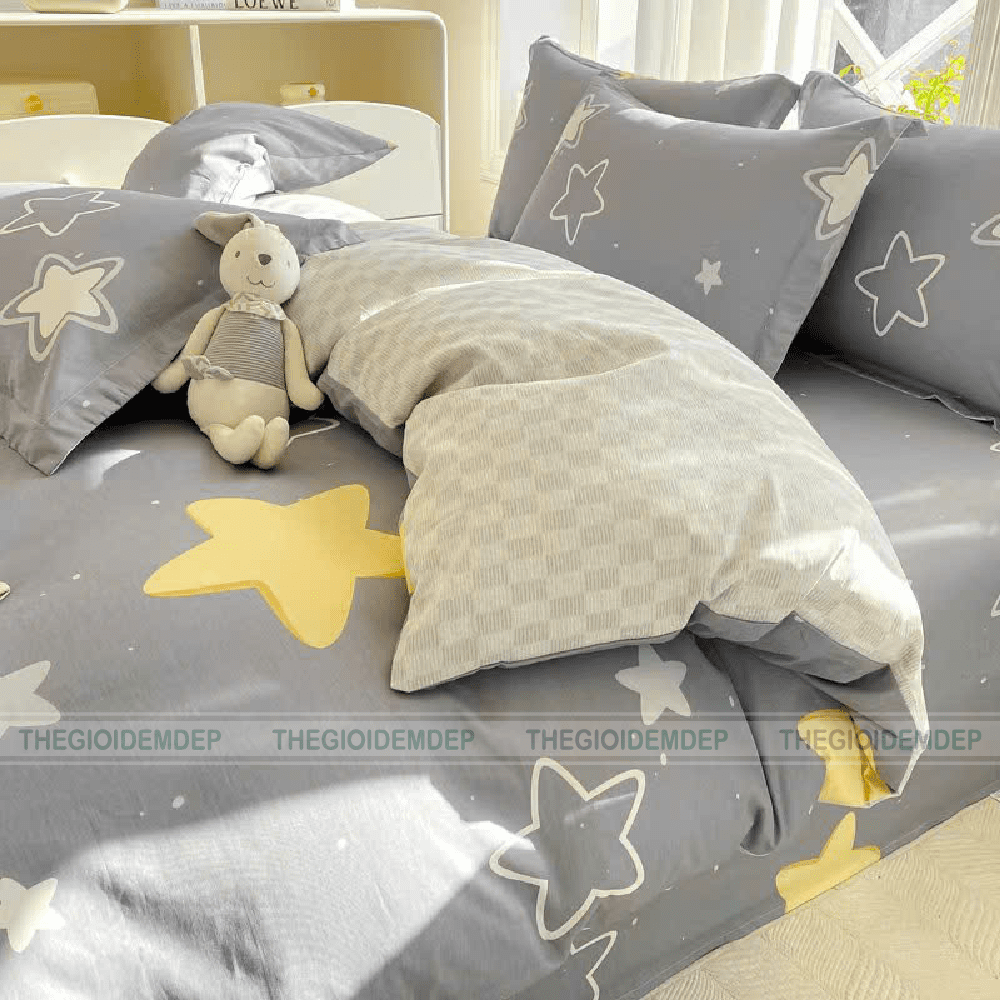 Với gam màu xám trung tính làm chủ đạo, kết hợp với các họa tiết ngôi sao vàng và be. Bộ sản phẩm tạo điểm nhấn nhẹ nhàng và tinh tế. Được làm từ chất liệu cotton thoáng mát đem lại cảm giác mềm mại, êm ái, nâng niu mọi giấc ngủ. Thiết kế phù hợp với nhiều phong cách nội thất khác nhau, đây là sự lựa chọn hoàn hảo cho những ai yêu thích sự đơn giản nhưng vẫn nổi bật và cá tính.