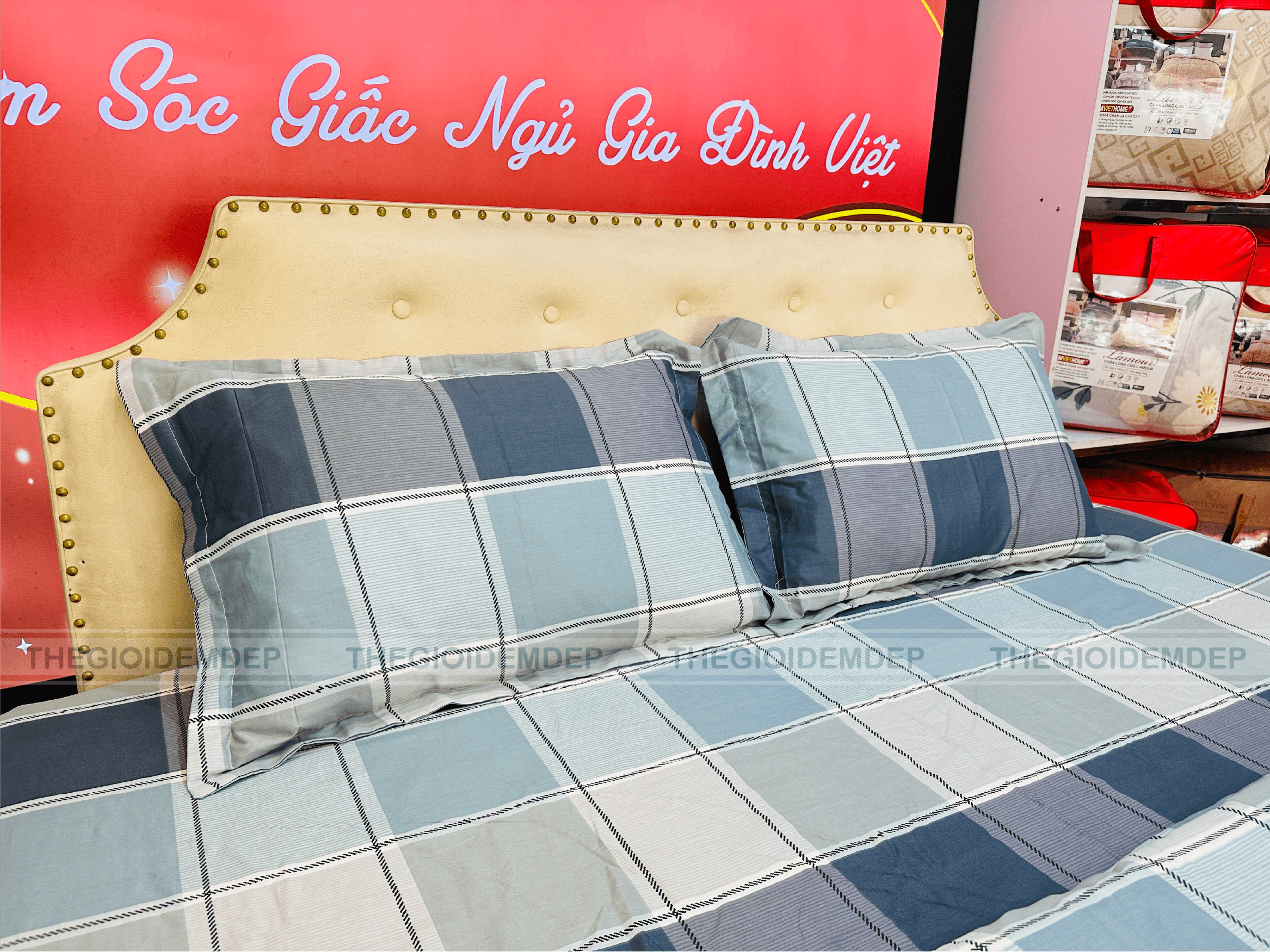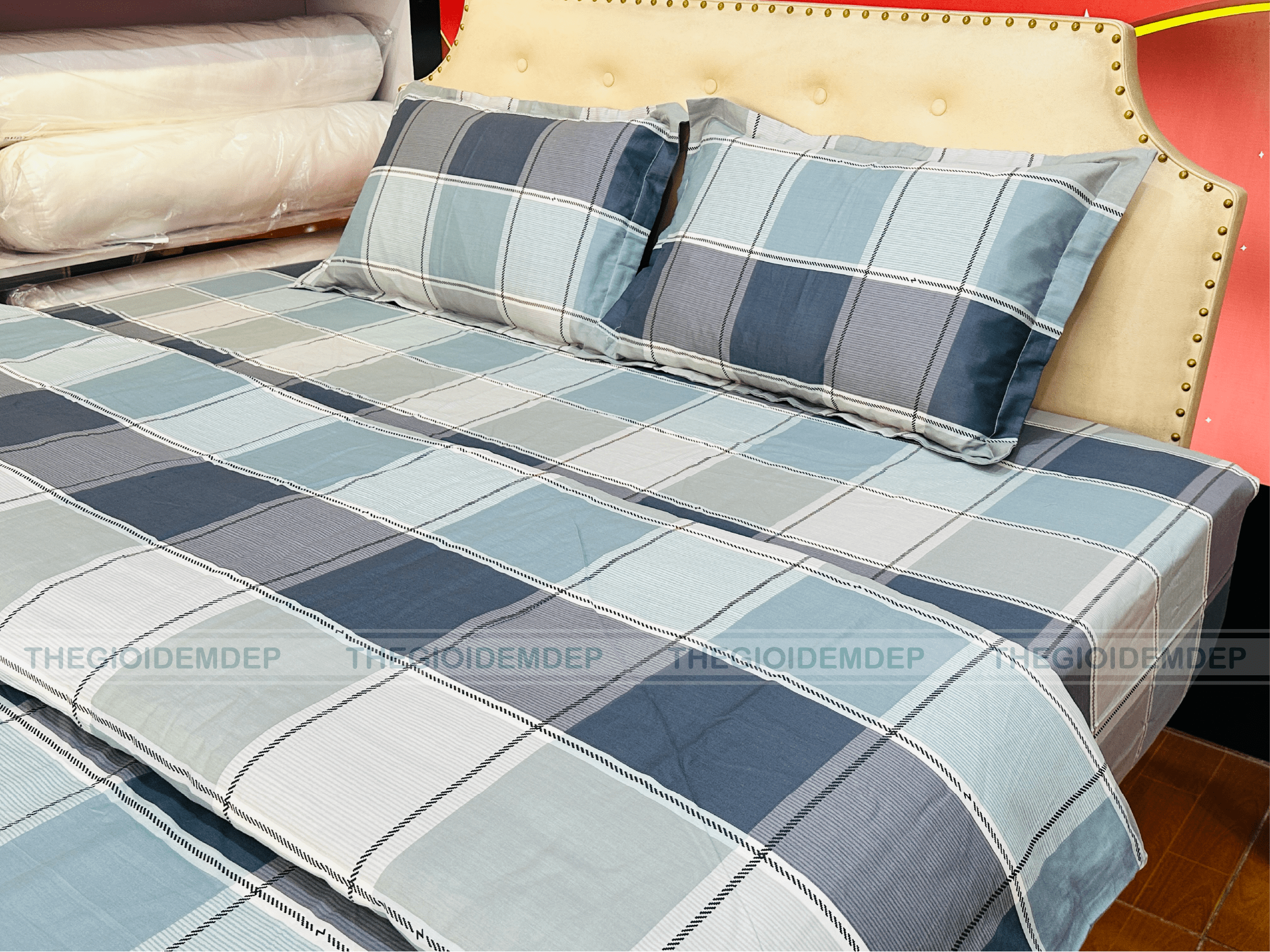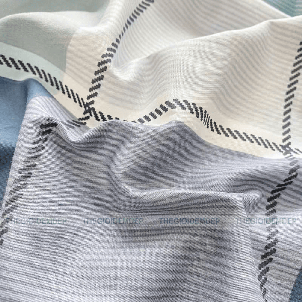 Xanh nhạt là gam màu lạnh, khi nhìn vào sẽ cảm nhận được cảm giác dễ chịu, thư giãn đầu óc sau một ngày làm việc mệt mỏi. Cùng với đó là màu xanh đậm tạo điểm nhấn mạnh mẽ, làm nổi bật cả bộ chăn ga. Làm cho sản phẩm có chiều sâu và cuốn hút hơn. Ngoài ra còn có màu xanh trung tính và đường viền kẻ trắng, được làm tỉ mỉ chi tiết, giúp cân bằng màu sắc và tạo nên vẻ đẹp nổi bật, rõ ràng.