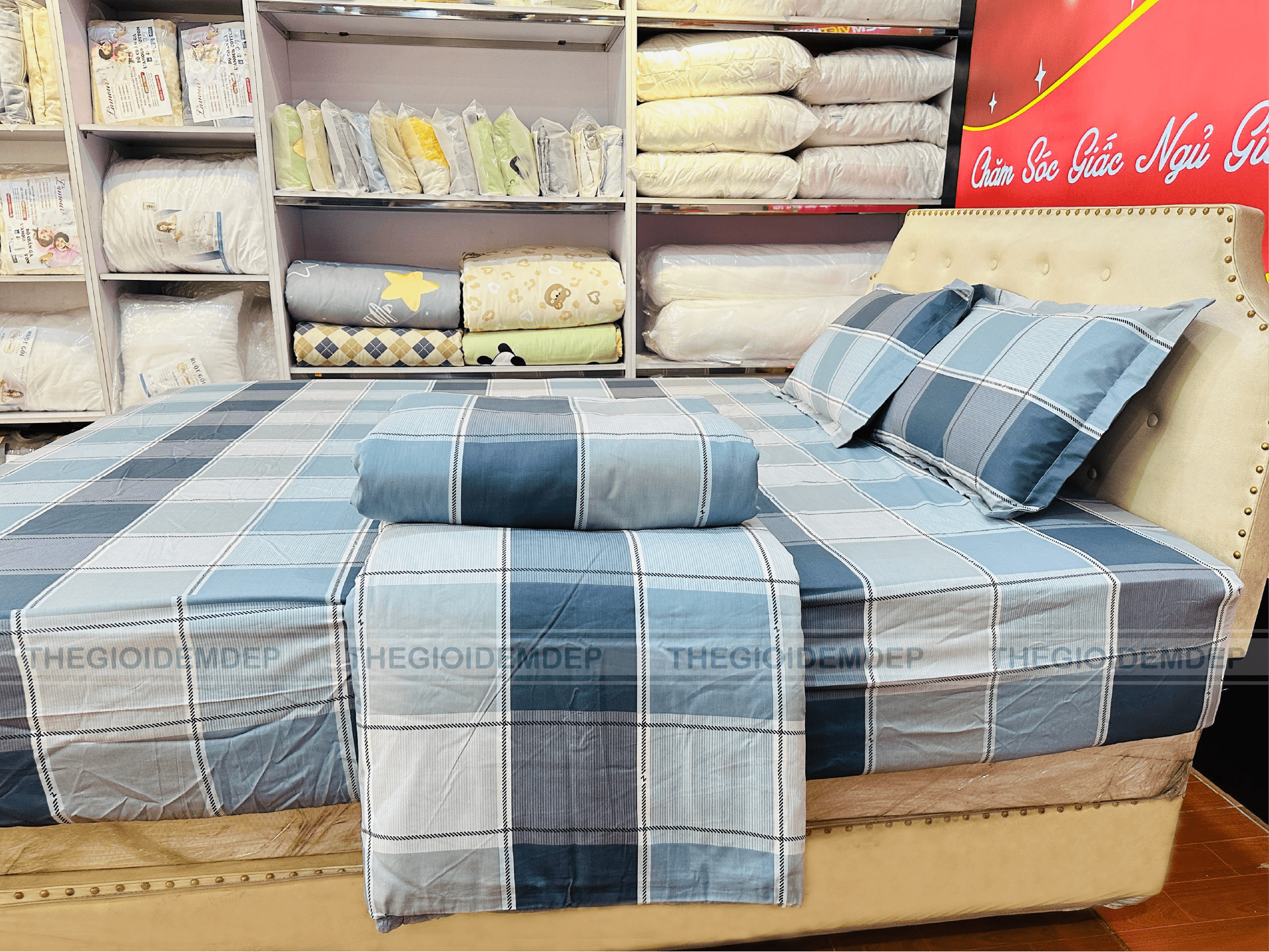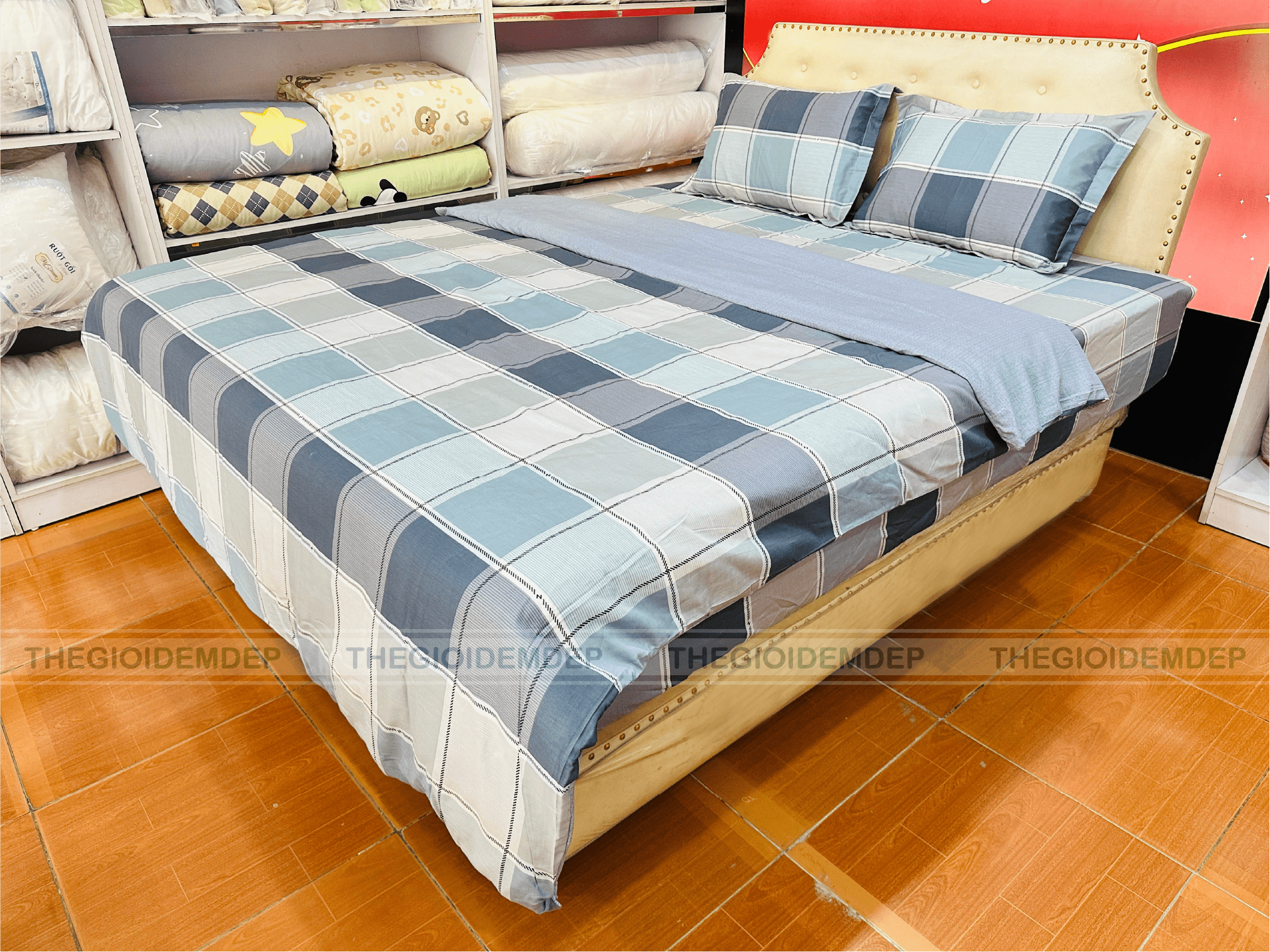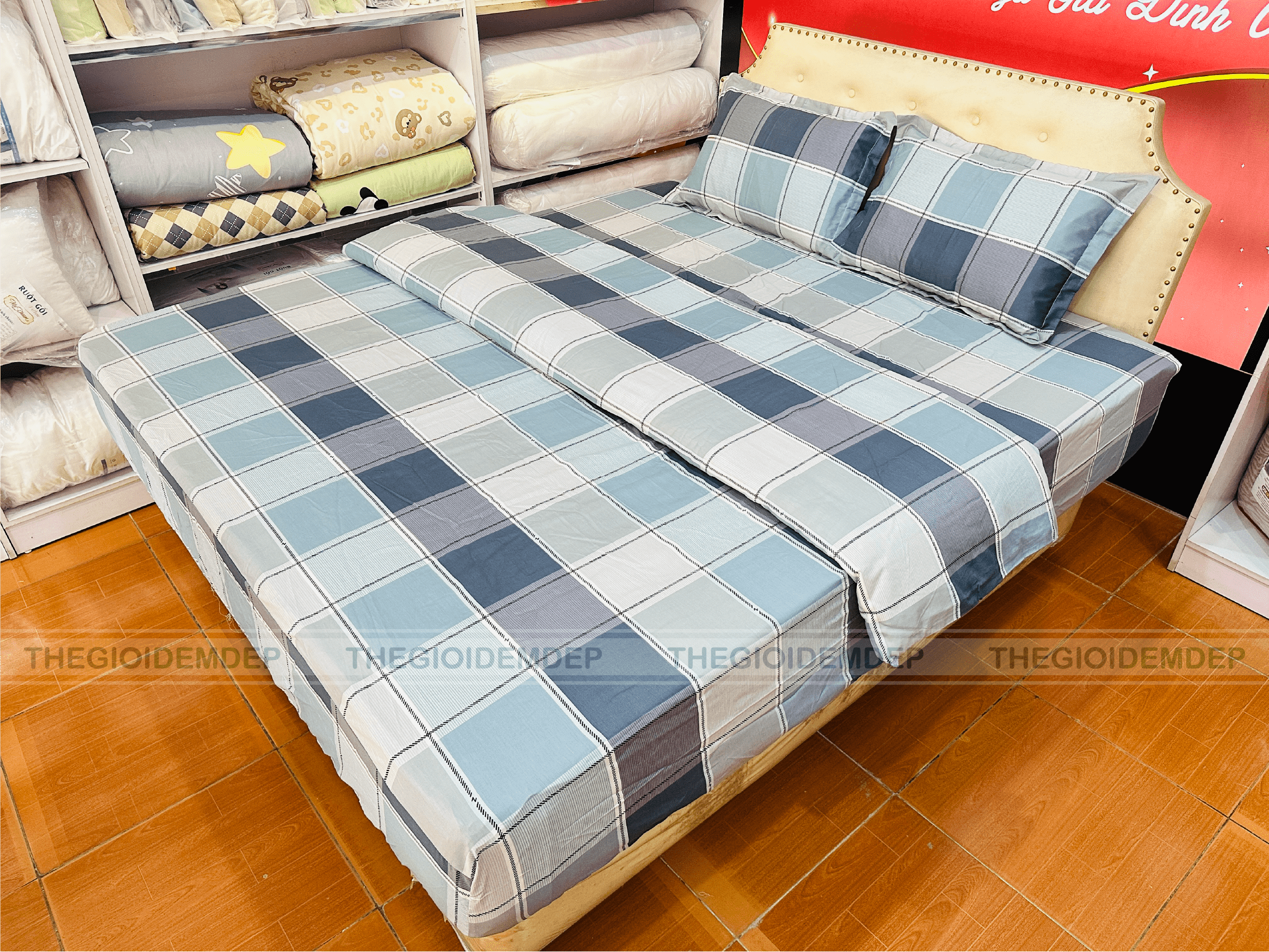 Xanh nhạt là gam màu lạnh, khi nhìn vào sẽ cảm nhận được cảm giác dễ chịu, thư giãn đầu óc sau một ngày làm việc mệt mỏi. Cùng với đó là màu xanh đậm tạo điểm nhấn mạnh mẽ, làm nổi bật cả bộ chăn ga. Làm cho sản phẩm có chiều sâu và cuốn hút hơn. Ngoài ra còn có màu xanh trung tính và đường viền kẻ trắng, được làm tỉ mỉ chi tiết, giúp cân bằng màu sắc và tạo nên vẻ đẹp nổi bật, rõ ràng.
