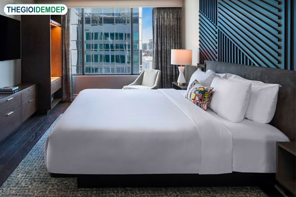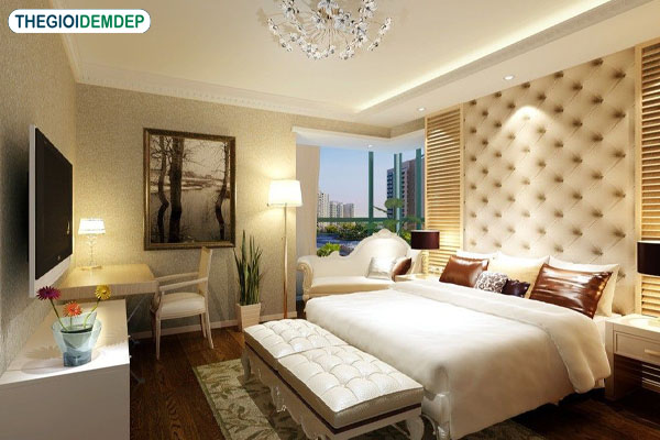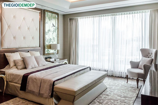 Màu sắc của giường, đệm cũng rất quan trọng. Thông thường các khách sạn 5 sao sẽ lựa chọn drap giường trắng hoặc các tone màu trầm ấm để tạo cảm giác sạch sẽ, thoải mái, dễ chịu. Bên cạnh đó, thiết kế phòng khách sạn 5 sao còn tận dụng tối đa ánh sáng tự nhiên để tạo hiệu ứng lung linh, lộng lẫy cho không gian nghỉ ngơi, thư giãn.