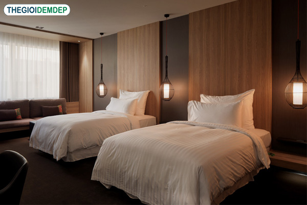 Thiết kế nội thất phòng 2 giường đơn sang trọng, hiện đại. Căn phòng nổi bật với sự kết hợp hài hoà giữa tone màu trắng của chăn ga gối đệm và màu gỗ ấm áp của nội thất. Không gian nghỉ ngơi ấn tượng sẽ mang đến trải nghiệm thư giãn lý tưởng cho giấc ngủ trọn vẹn.